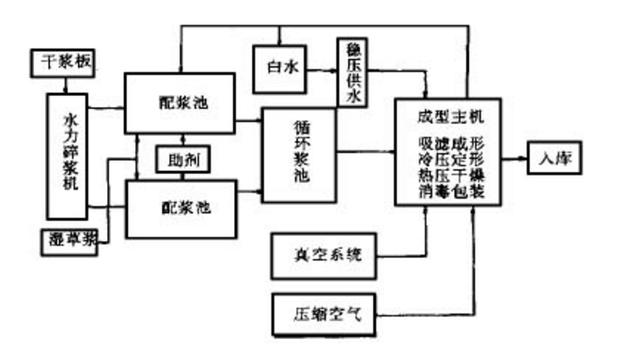 ② 生產工藝先進, 整個生產過程(從漿料注入到成品包裝) 在兩臺機械上自動完成。生產過程為無排放閉式循環(huán)過程, 無污染。